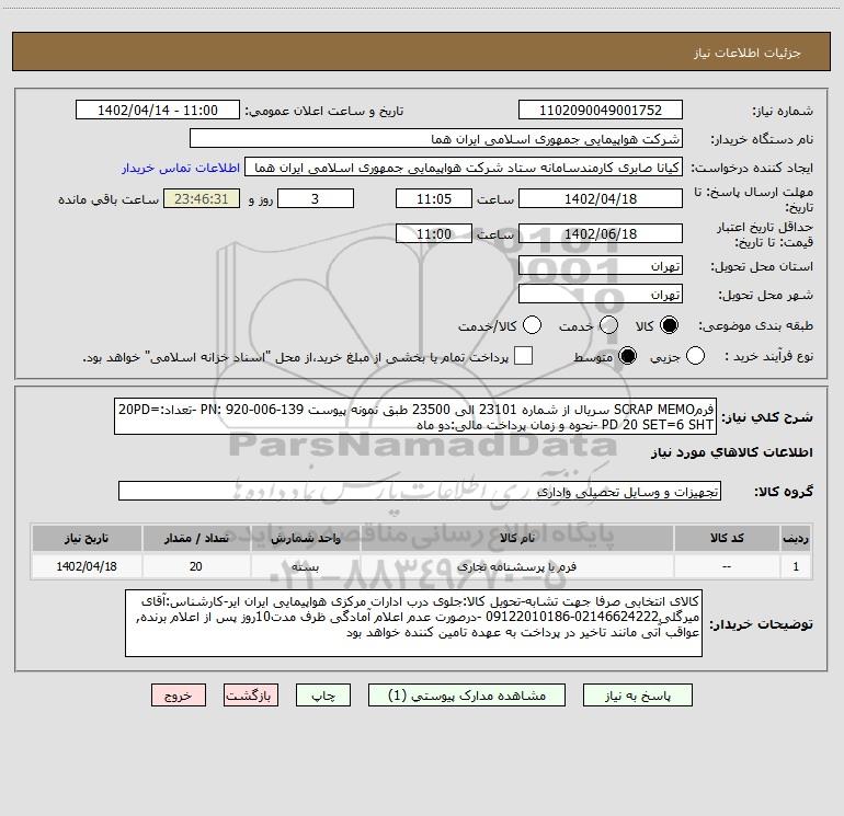 شرح کلی نیاز: فرمSCRAP MEMO سریال از شماره 23101 الی 23500 طبق نمونه پیوست PN: 920-006-139 -تعداد:20PD= PD 20 SET=6 SHT -نحوه و زمان پرداخت مالی:دو ماه