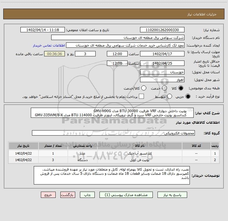 شرح کلی نیاز: یونیت داخلی دیواری VRF ظرفیت 30000 BTU مدل GMV-N90G