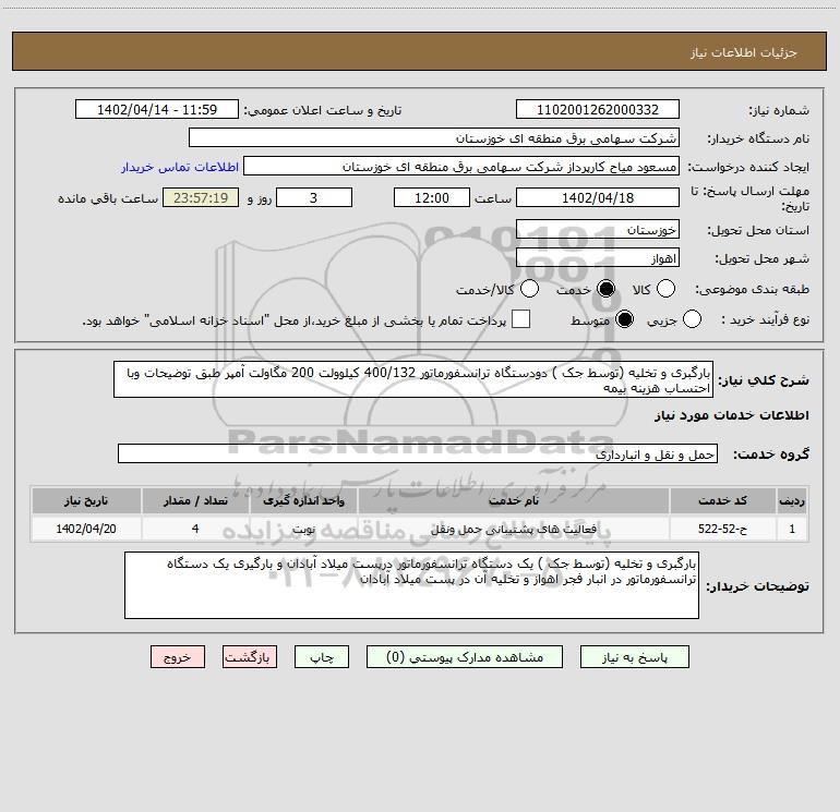 توضیحات خریدار:بارگبری و تخلیه (توسط جک ) یک دستگاه ترانسفورماتور درپست میلاد آبادان و بارگیری یک دستگاه ترانسفورماتور در انبار فجر اهواز و تخلیه آن در پست میلاد آبادان