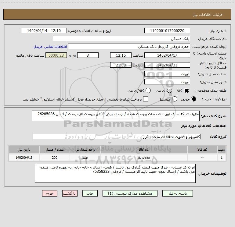 شرح کلی نیاز: ماژول شبکه ..../ طبق مشخصات پیوست شده / ارسال پیش فاکتور پیوست الزامیست / فکس 26205036
