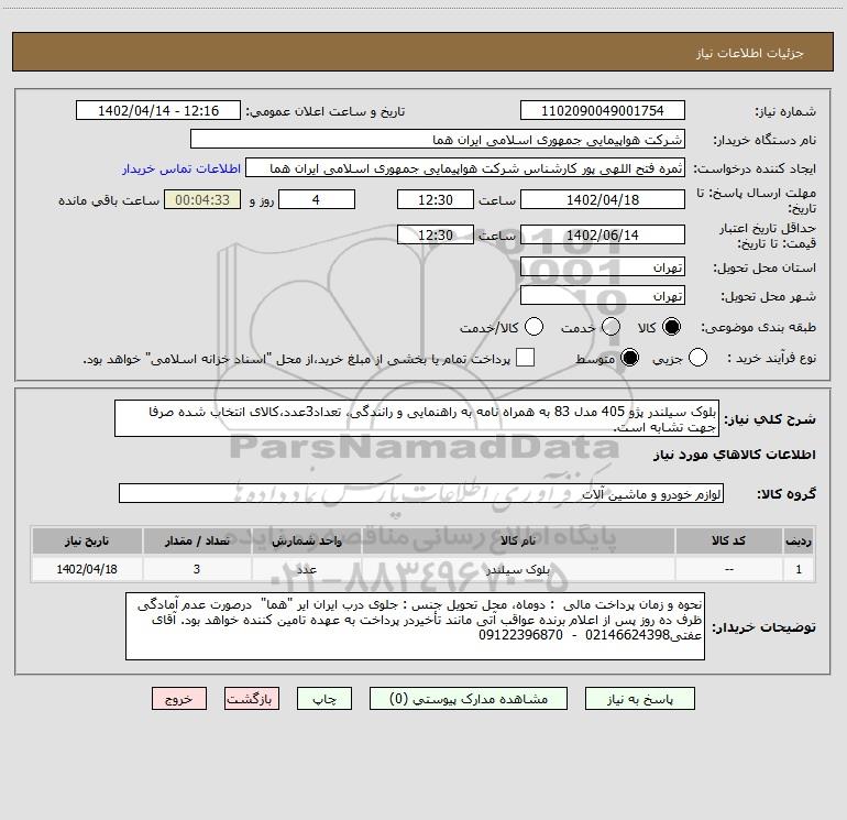 شرح کلی نیاز: بلوک سیلندر پژو 405 مدل 83 به همراه نامه به راهنمایی و رانندگی، تعداد3عدد،کالای انتخاب شده صرفا جهت تشابه است.