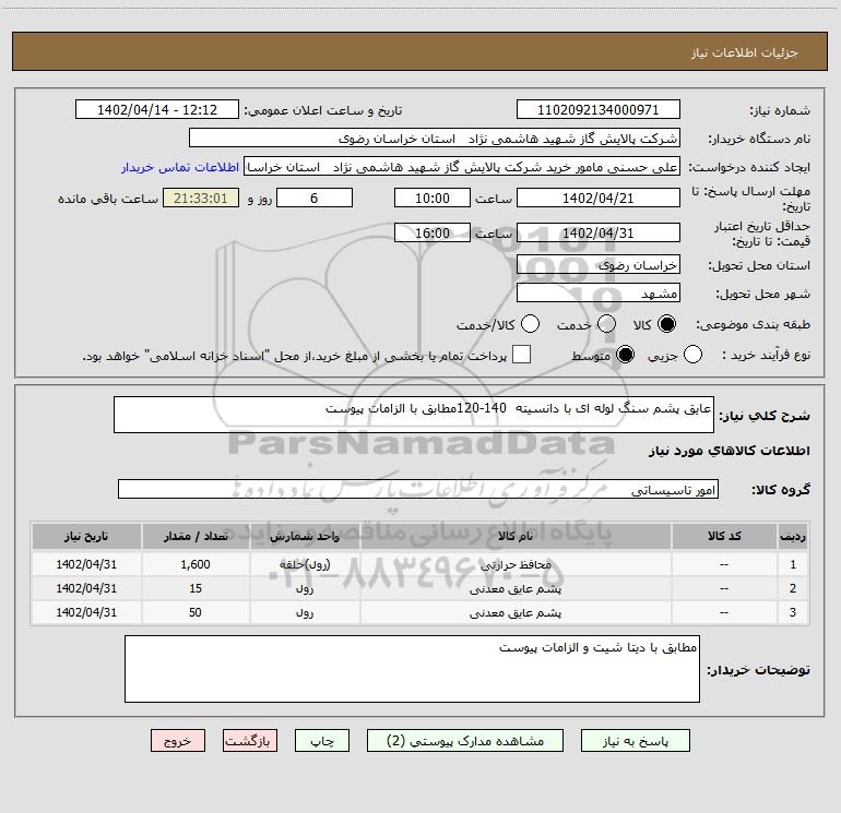 نام دستگاه خریدار:شرکت پالایش گاز شهید هاشمی نژاد استان خراسان رضوی