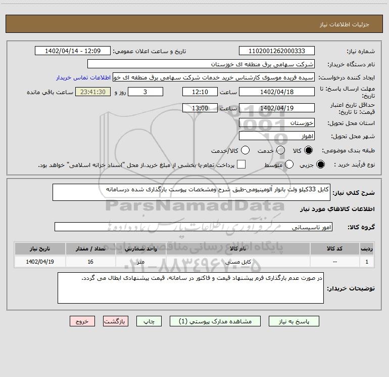 شرح کلی نیاز: کابل 33کیلو ولت بانوار آلومینیومی-طبق شرح ومشخصات پیوست بارگذاری شده درسامانه