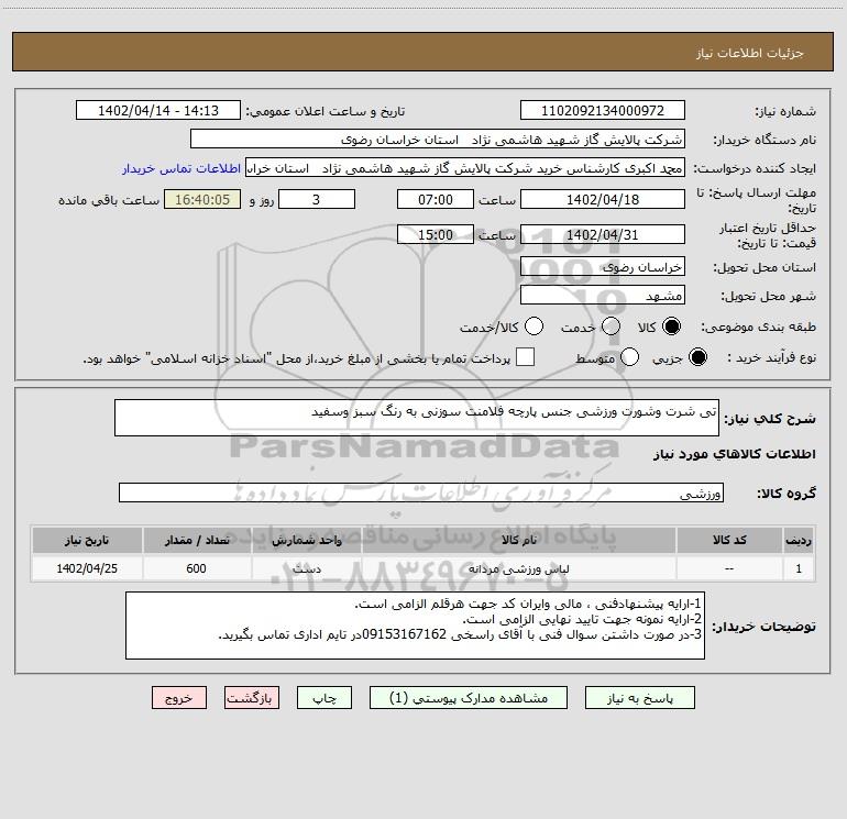 نام دستگاه خریدار:شرکت پالایش گاز شهید هاشمی نژاد استان خراسان رضوی