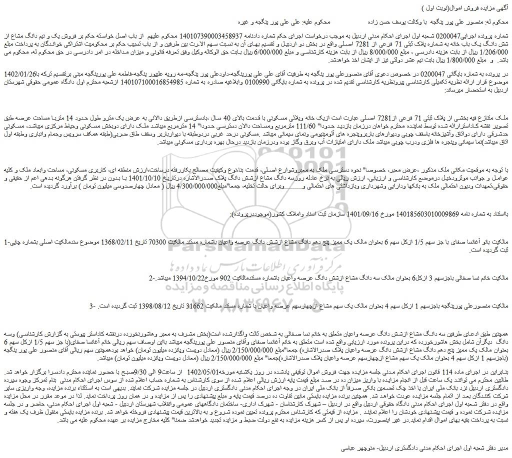 مزایده ملک از پلاک ثبتی 71 فرعی از7281 اصلی, مزایده ملک از پلاک ثبتی 71 فرعی از7281 اصلی