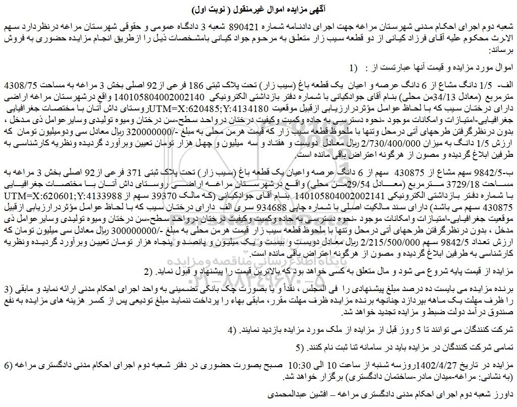 شعبه دوم اجرای احکام مدنی شهرستان مراغه جهت اجرای دادنامه شماره 890421 شعبه 3 دادگاه عمومی و حقوقی شهرستان مراغه درنظردارد سهم الارث محکوم علیه آقای فرزاد کیانی از دو قطعه سیب زار متعلق به مرحوم جواد کیانی بامشخصات ذیل را ازطریق انجام مزایده حضوری به فروش برساند: