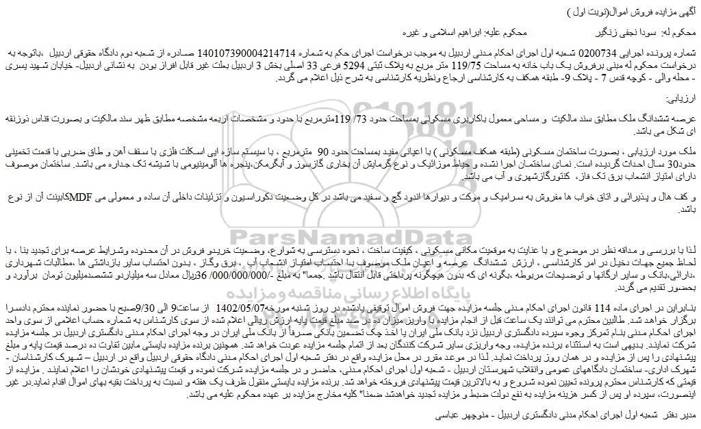 شماره پرونده اجرایی 0200734 شعبه اول اجرای احکام مدنی اردبیل به موجب درخواست اجرای حکم به شماره 140107390004214714 صادره از شعبه دوم دادگاه حقوقی اردبیل  ،باتوجه به درخواست محکوم له مبنی برفروش یک باب خانه به مساحت 119/75 متر مربع به پلاک ثبتی 5294 فرعی 33 اصلی بخش 3 اردبیل بعلت غیر قابل افراز بودن  به نشانی اردبیل- خیابان شهید یسری - محله والی - کوچه قدس 7 - پلاک 9- طبقه همکف به کارشناسی ارجاع ونظریه کارشناسی به شرح ذیل اعلام می گردد.