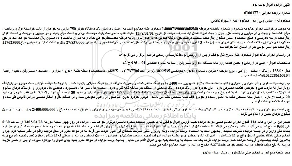 مشخصات اموال : مبنی بر ارزیابی و تعیین قیمت روز یک دستگاه سواری سیتروئن زانتیا به شماره انتظامی 91 – 926 ج 42