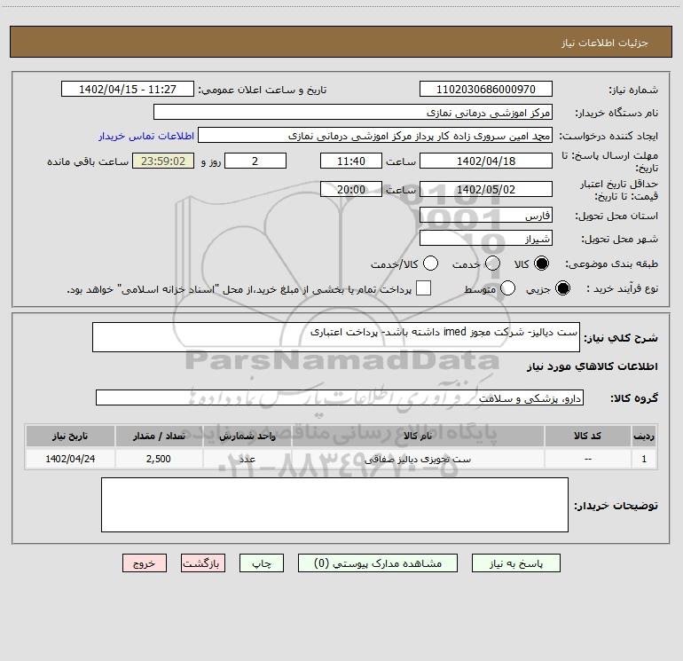 شرح کلی نیاز: ست دیالیز- شرکت مجوز imed داشته باشد- پرداخت اعتباری