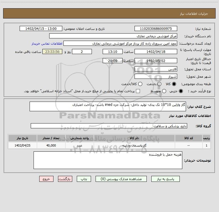 شرح کلی نیاز: گاز وازلین 10*10 تک پدی- تولید داخل- شرکت جزء imed باشد- پرداخت اعتباری