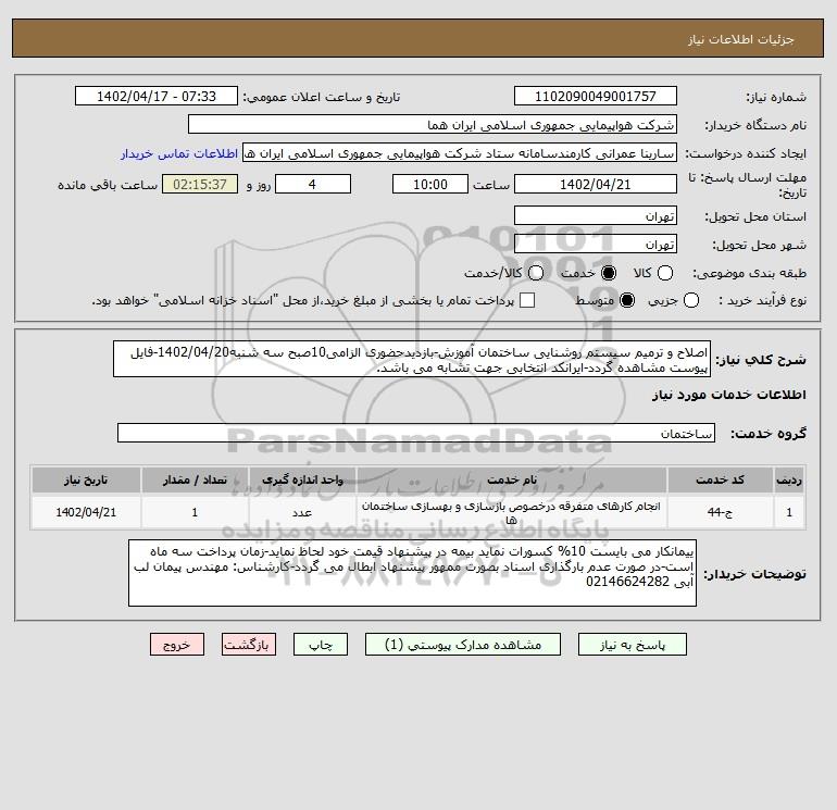 شرح کلی نیاز: اصلاح و ترمیم سیستم روشنایی ساختمان آموزش-بازدیدحضوری الزامی10صبح سه شنبه1402/04/20-فایل پیوست مشاهده گردد-ایرانکد انتخابی جهت تشابه می باشد.