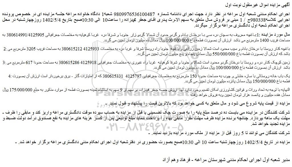 - مزایده در تاریخ 1402/5/4 روزچهارشنبه ساعت 10 الی 10:30صبح بصورت حضوری در دفترشعبه اول اجرای احکام مدنی دادگستری مراغه برگزار خواهد شد.