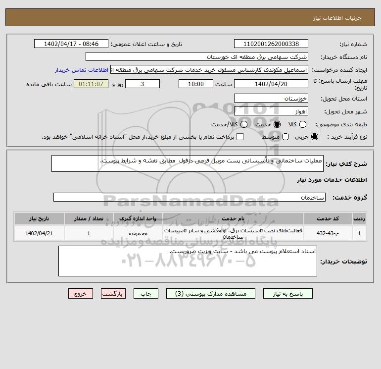 شرح کلی نیاز: عملیات ساختمانی و تاًسیساتی پست موبیل فرعی دزفول مطابق نقشه و شرایط پیوست.