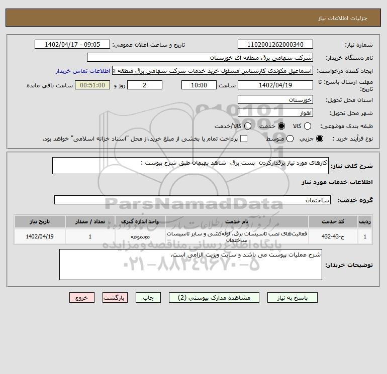 شرح کلی نیاز: کارهای مورد نیاز برقدارکردن پست برق شاهد بهبهان طبق شرح پیوست :
