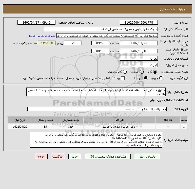 شرح کلی نیاز: شارژر فندکی 20 W PROMATE با لوگوی ایران ایر - تعداد 65 عدد - کالای انتخاب شده صرفا جهت تشابه می باشد.