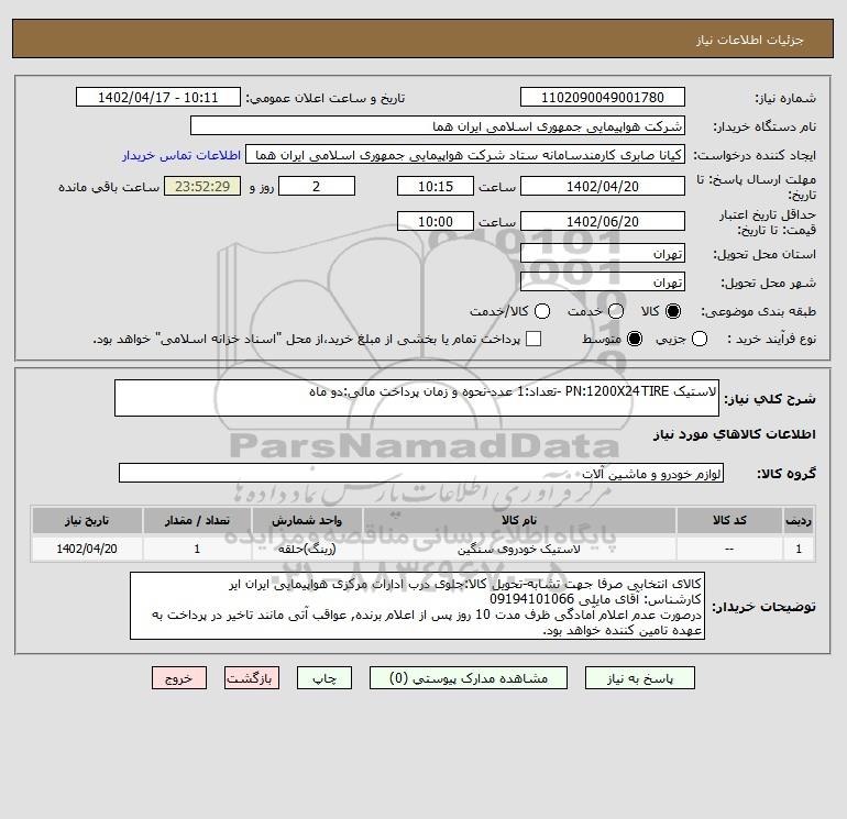 شرح کلی نیاز: لاستیک PN:1200X24TIRE -تعداد:1 عدد-نحوه و زمان پرداخت مالی:دو ماه