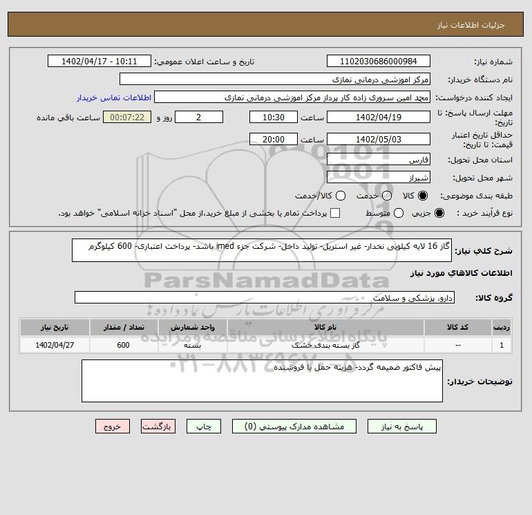 شرح کلی نیاز: گاز 16 لایه کیلویی نخدار- غیر استریل- تولید داخل- شرکت جزء imed باشد- پرداخت اعتباری- 600 کیلوگرم