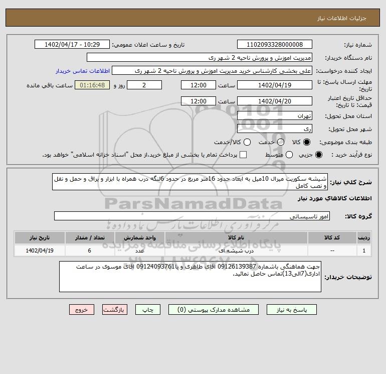 استعلام شیشه سکوریت میرال 10میل به ابعاد حدود 16متر مربع در حدود 6لنگه درب همراه با ابزار و یراق و حمل و نقل و نصب کامل, استعلام شیشه سکوریت میرال 10میل به ابعاد حدود 16متر مربع در حدود 6لنگه درب همراه با ابزار و یراق و حمل و نقل و نصب کامل