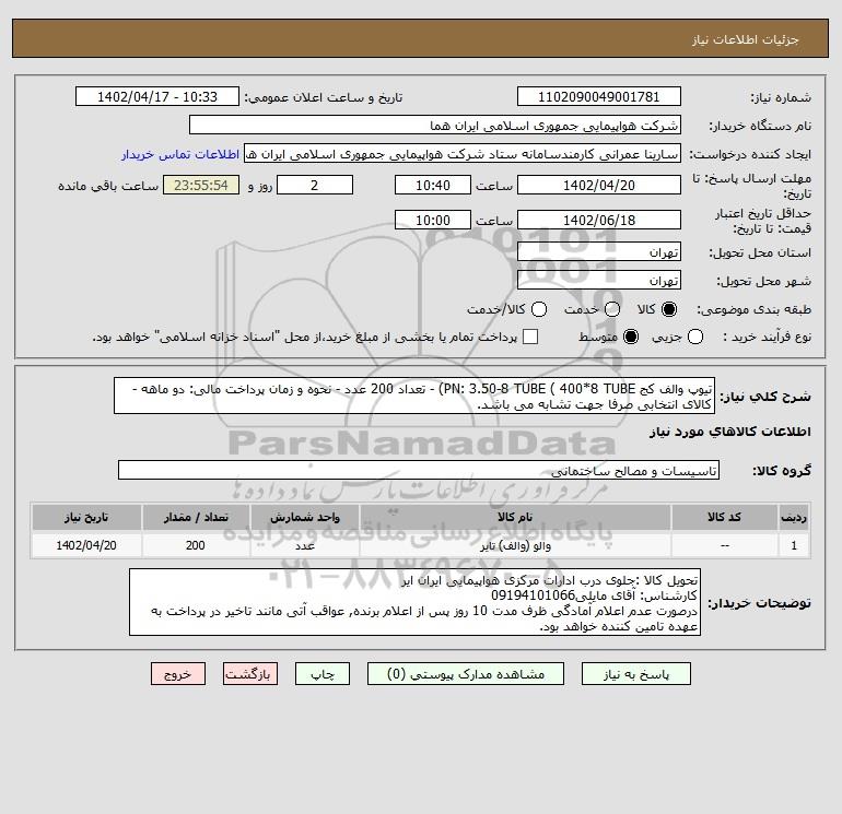 شرح کلی نیاز: تیوپ والف کج PN: 3.50-8 TUBE ( 400*8 TUBE) - تعداد 200 عدد - نحوه و زمان پرداخت مالی: دو ماهه - کالای انتخابی صرفا جهت تشابه می باشد.