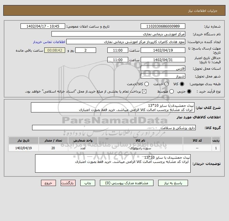 شرح کلی نیاز: نیدل جمشیدی با سایز 10*13 ایران کد مشابه برچسب اصالت کالا الزامی میباشد. خرید فقط بصورت اعتباری