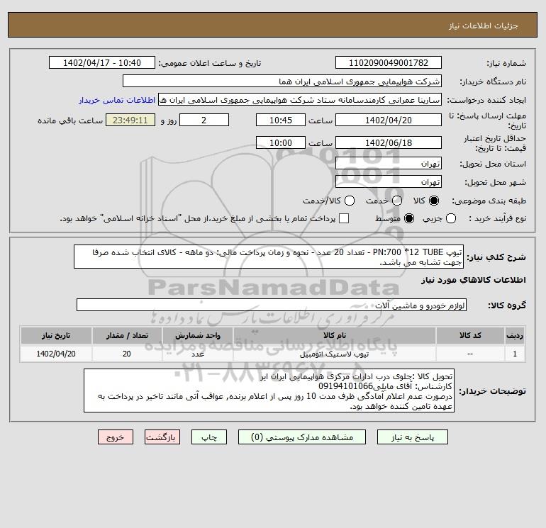 شرح کلی نیاز: تیوپ PN:700 *12 TUBE - تعداد 20 عدد - نحوه و زمان پرداخت مالی: دو ماهه - کالای انتخاب شده صرفا جهت تشابه می باشد.