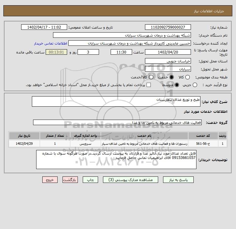 شرح کلی نیاز: طبخ و توزیع غذای بیمارستان