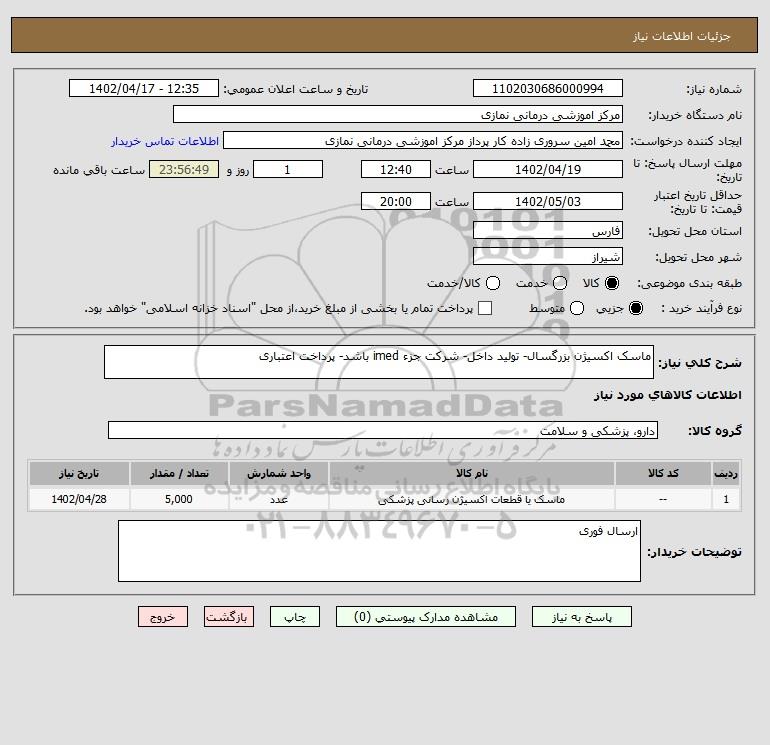 شرح کلی نیاز: ماسک اکسیژن بزرگسال- تولید داخل- شرکت جزء imed باشد- پرداخت اعتباری