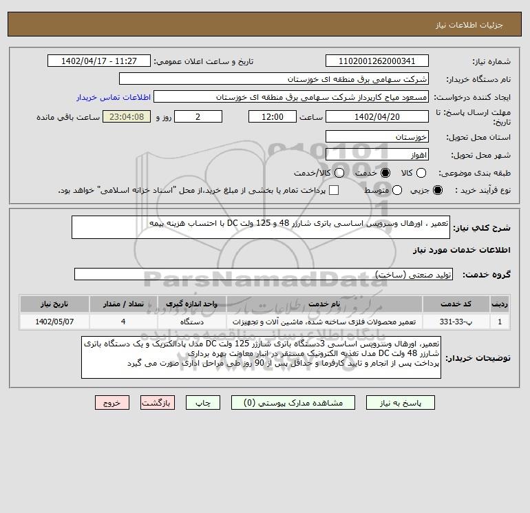 شرح کلی نیاز: تعمیر ، اورهال وسرویس اساسی باتری شارژر 48 و 125 ولت DC با احتساب هزینه بیمه