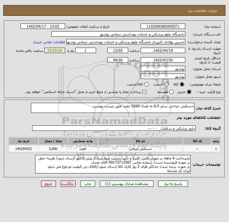 شرح کلی نیاز: دستکش جراحی سایز 6.5 به تعداد 5000 جفت طبق لیست پیوست