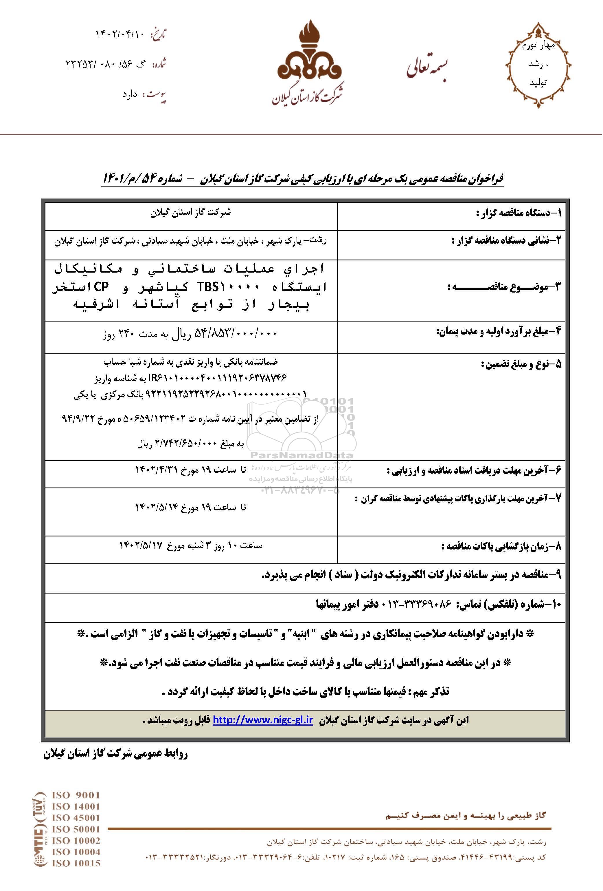 فراخوان مناقصه عمومی یک مرحله ای با ارزیابی کیفی شرکت گاز استان گیلان شماره 54/ م / 1402