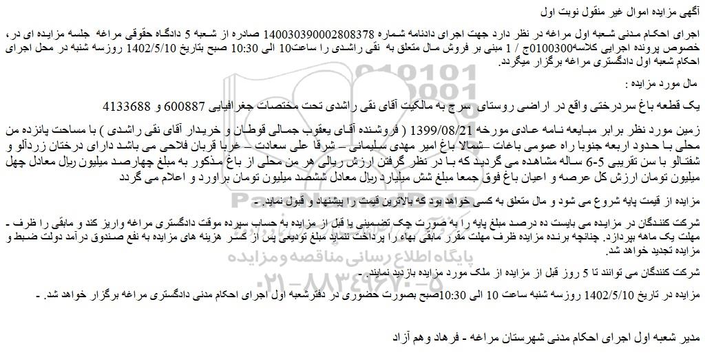 - مزایده در تاریخ 1402/5/10 روزسه شنبه ساعت 10 الی 10:30صبح بصورت حضوری در دفترشعبه اول اجرای احکام مدنی دادگستری مراغه برگزار خواهد شد.