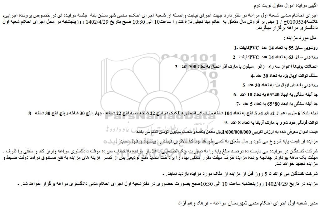- مزایده در تاریخ 1402/4/29 روزپنجشنبه ساعت 10 الی 10:30صبح بصورت حضوری در دفترشعبه اول اجرای احکام مدنی دادگستری مراغه برگزار خواهد شد.