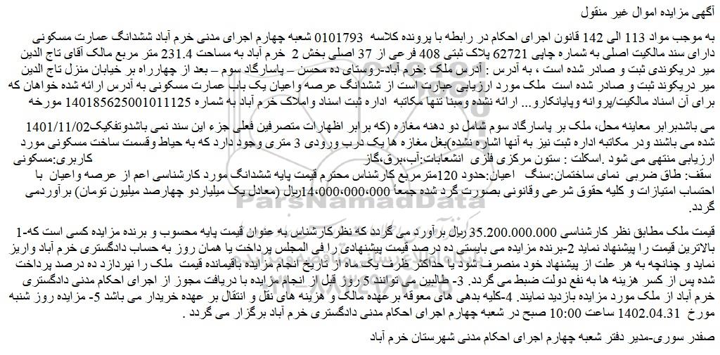 به موجب مواد 113 الی 142 قانون اجرای احکام در رابطه با پرونده کلاسه  0101793 شعبه چهارم اجرای مدنی خرم آباد ششدانگ عمارت مسکونی دارای سند مالکیت اصلی به شماره چاپی 62721 پلاک ثبتی 408 فرعی از 37 اصلی بخش 2  خرم آباد به مساحت 231.4 متر مربع مالک آقای تاج الدین میر دریکوندی ثبت و صادر شده است ، به آدرس : آدرس ملک :خرم آباد-روستای ده محسن – پاسارگاد سوم – بعد از چهارراه بر خیابان منزل تاج الدین میر دریکوند ثبت و صادر شده است  ملک مورد ارزیابی عبارت است از ششدانگ عرصه واعیان یک باب عمارت مسکونی به آدرس ارائه شده خواهان که برای آن اسناد مالکیت/پروانه وپایانکارو... ارائه نشده ومبنا تنها مکاتبه  اداره ثبت اسناد واملاک خرم آباد به شماره 140185625001011125 مورخه