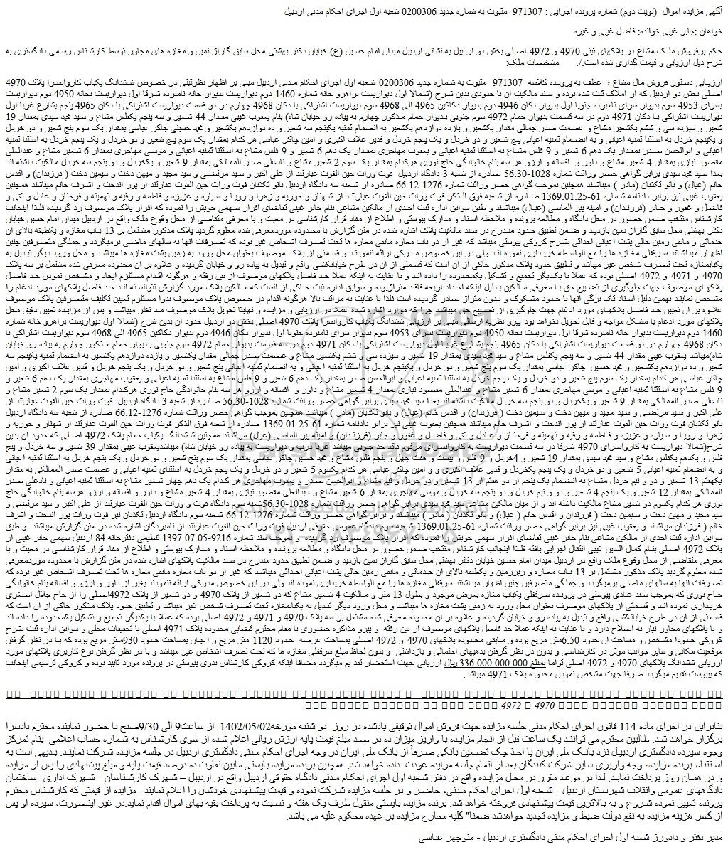 آگهی مزایده اموال (نویت دوم) شماره پرونده اجرایی : 971307 مثبوت به شماره جدید 0200306 شعبه اول اجرای احکام مدنی اردبیل