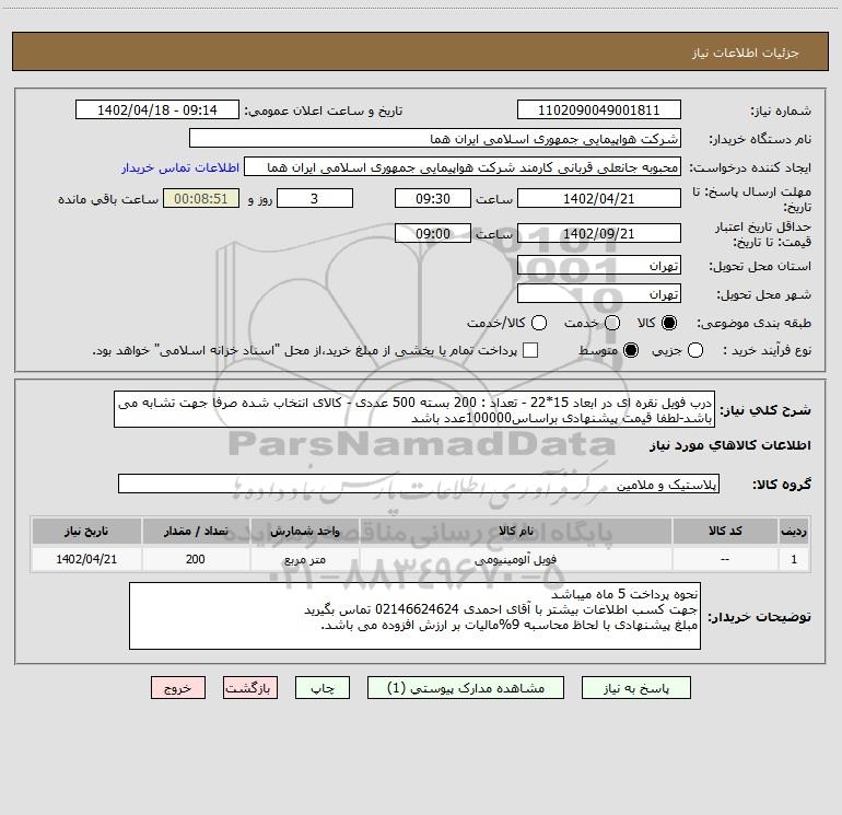 شرح کلی نیاز: درب فویل نقره ای در ابعاد 15*22 - تعداد : 200 بسته 500 عددی - کالای انتخاب شده صرفا جهت تشابه می باشد-لطفا قیمت پیشنهادی براساس100000عدد باشد