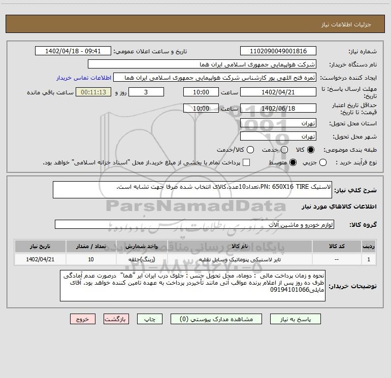 شرح کلی نیاز: لاستیک PN: 650X16 TIRE،تعداد10عدد،کالای انتخاب شده صرفا جهت تشابه است.
