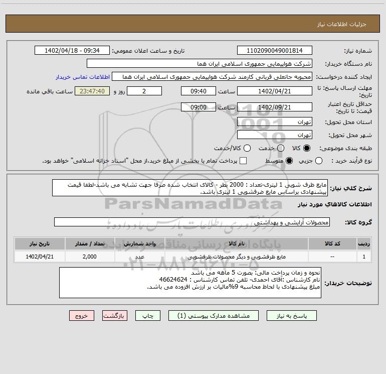 شرح کلی نیاز: مایع ظرف شویی 1 لیتری-تعداد : 2000 بطر - کالای انتخاب شده صرفا جهت تشابه می باشد-لطفا قیمت پیشنهادی براساس مایع ضرفشویی 1 لیتری باشد.