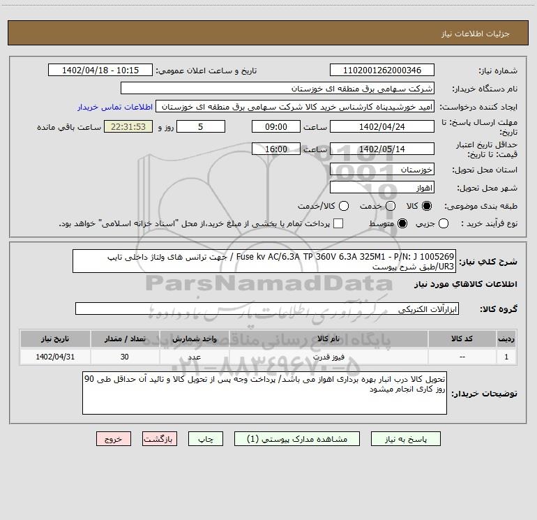 شرح کلی نیاز: Fuse kv AC/6.3A TP 360V 6.3A 325M1 - P/N: J 1005269 / جهت ترانس های ولتاژ داخلی تایپ UR3/طبق شرح پیوست