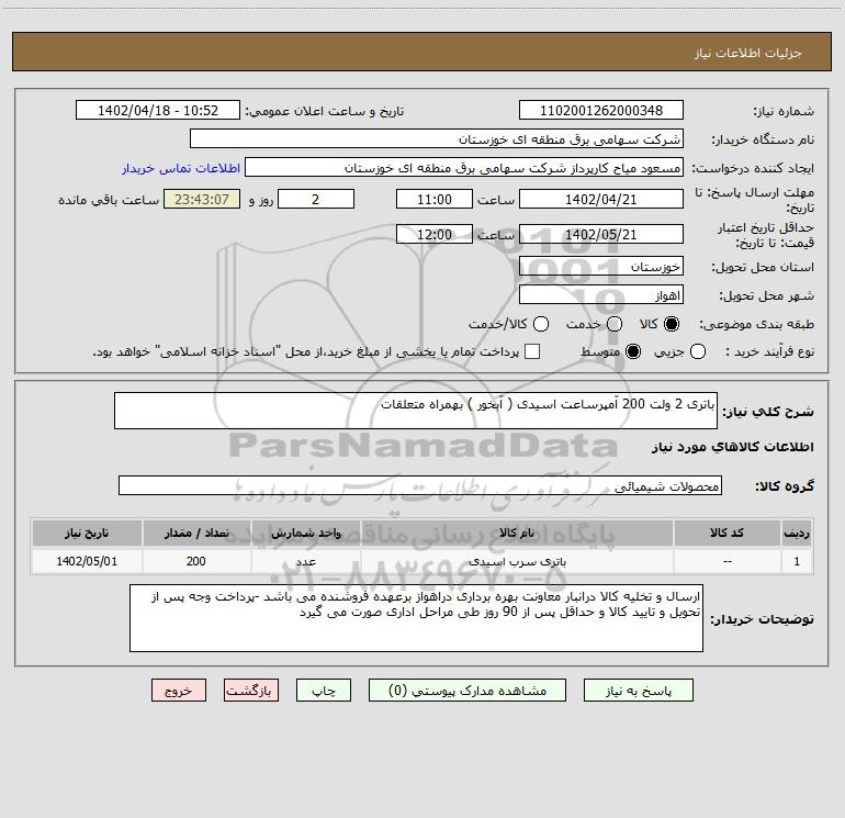 شرح کلی نیاز: باتری 2 ولت 200 آمپرساعت اسیدی ( آبخور ) بهمراه متعلقات