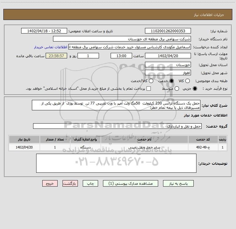 شرح کلی نیاز: حمل یک دستگاه ترانس 230 کیلوولت 50مگا ولت آمپر با وزن تقریبی 77 تن توسط بوژی از طریق یکی از مسیرهای ذیل با بیمه تمام خطر: