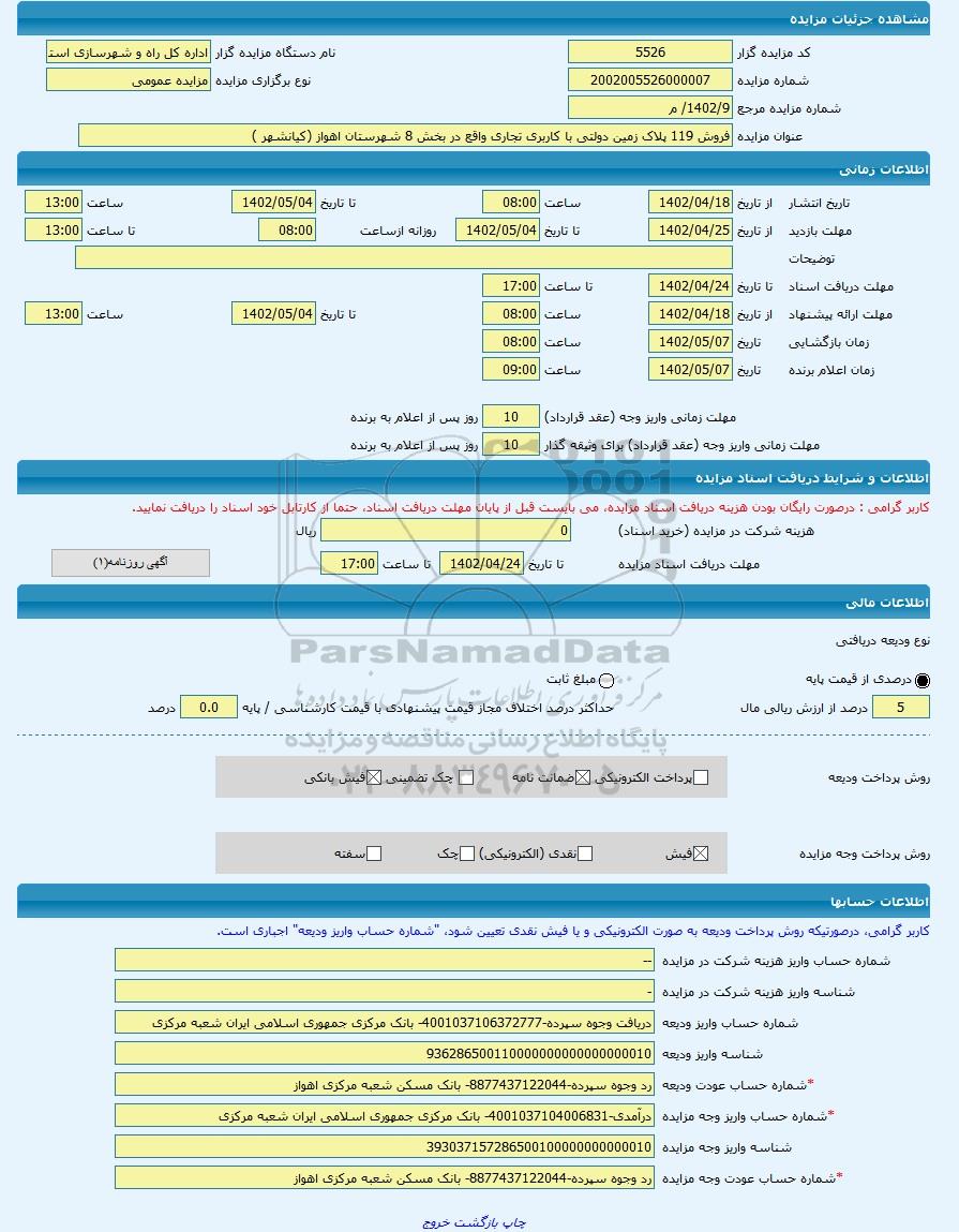 | عنوان مزایده | فروش 119 پلاک زمین دولتی با کاربری تجاری واقع در بخش 8 شهرستان اهواز (کیانشهر ) -مزایده زمین - استان خوزستان | |||