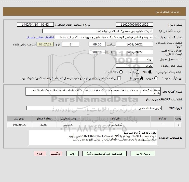 شرح کلی نیاز: سینه مرغ منجمد بی خس بدون چربی و ضایعات-مقدار : 3 تن - کالای انتخاب شده صرفا جهت تشابه می باشد