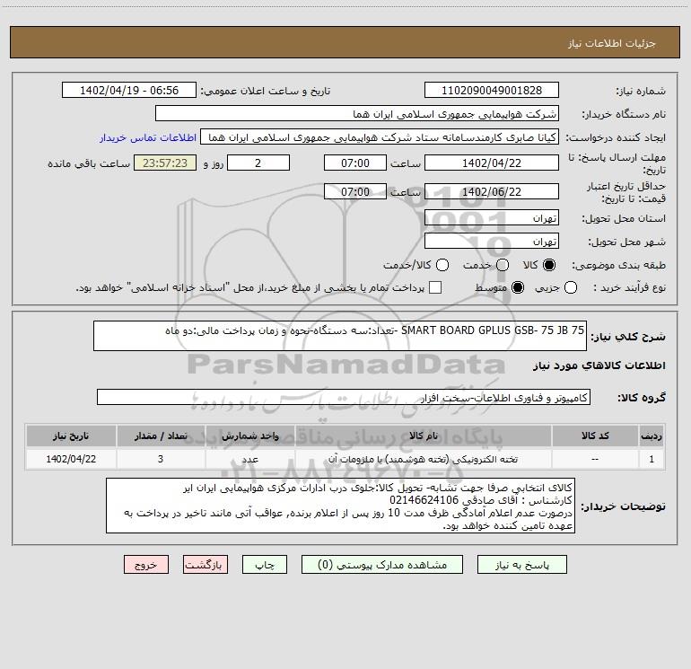 شرح کلی نیاز: SMART BOARD GPLUS GSB- 75 JB 75 -تعداد:سه دستگاه-نحوه و زمان پرداخت مالی:دو ماه