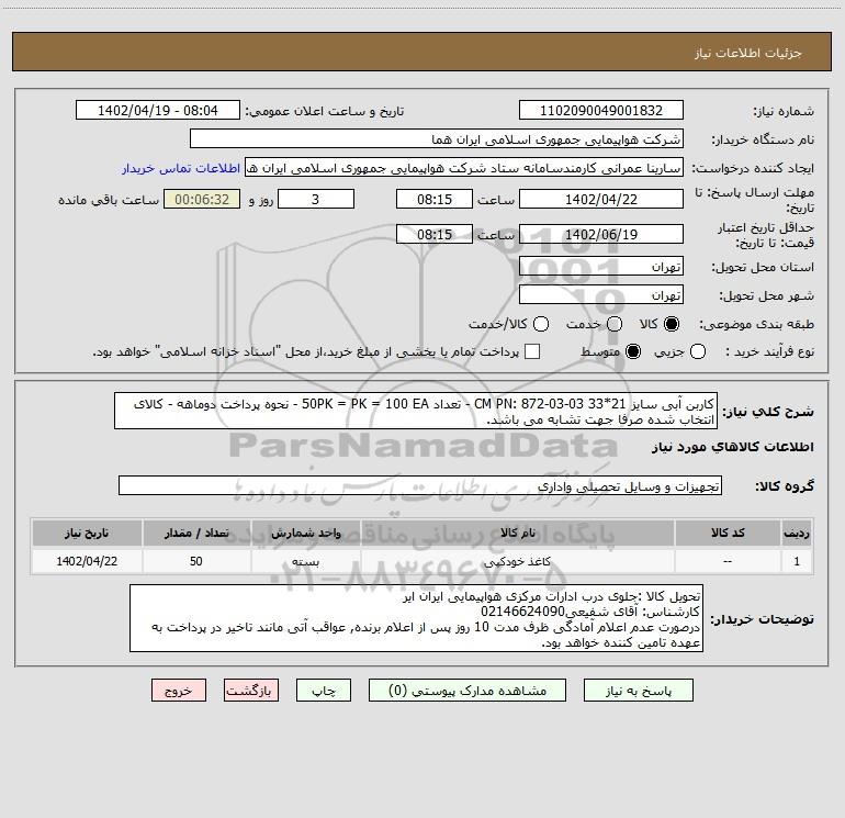 شرح کلی نیاز: کاربن آبی سایز 21*33 CM PN: 872-03-03 - تعداد 50PK = PK = 100 EA - نحوه پرداخت دوماهه - کالای انتخاب شده صرفا جهت تشابه می باشد.