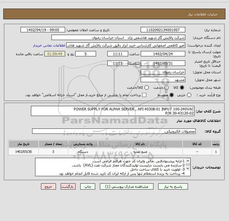 استعلام POWER SUPPLY FOR ALPHA SERVER , API 4030B-01 INPUT 100-240VAC P/N 30-43120-02, استعلام POWER SUPPLY FOR ALPHA SERVER , API 4030B-01 INPUT 100-240VAC P/N 30-43120-02
