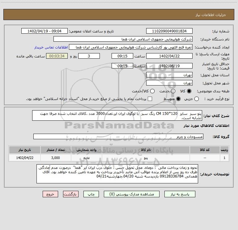 شرح کلی نیاز: پتو سبز سایز 120*150 CM رنگ سبز با لوگوی ایران ایر،تعداد3000 عدد ،کالای انتخاب شده صرفا جهت تشابه است.
