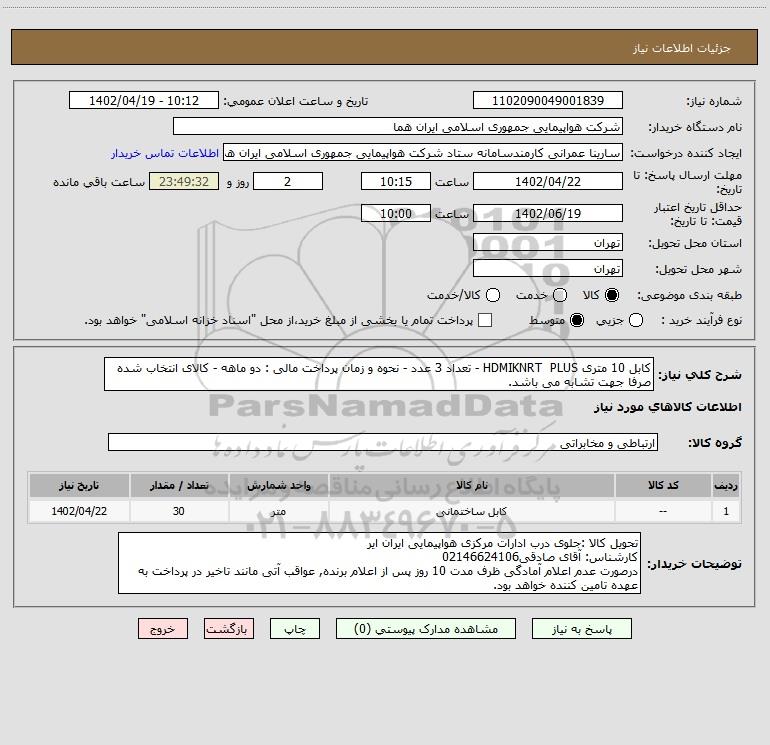 شرح کلی نیاز: کابل 10 متری HDMIKNRT PLUS - تعداد 3 عدد - نحوه و زمان پرداخت مالی : دو ماهه - کالای انتخاب شده صرفا جهت تشابه می باشد.