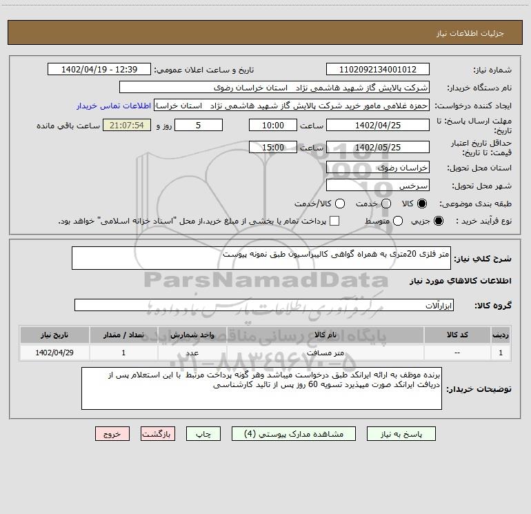 شرح کلی نیاز: متر فلزی 20متری به همراه گواهی کالیبراسیون طبق نمونه پیوست