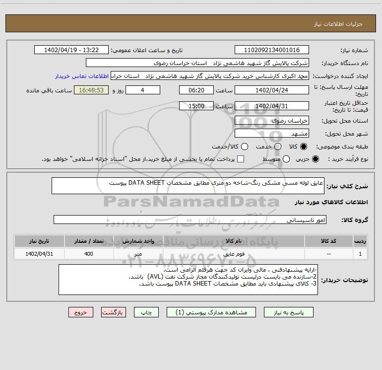 نام دستگاه خریدار:شرکت پالایش گاز شهید هاشمی نژاد استان خراسان رضوی