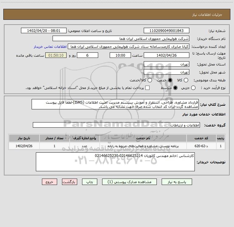 شرح کلی نیاز: قرارداد مشاوره، طراحی، استقرار و آموزش سیستم مدیریت امنیت اطلاعات (ISMS)-لطفا فایل پیوست مشاهده گردد-ایران کد انتخاب شده صرفا جهت تشابه می باشد.